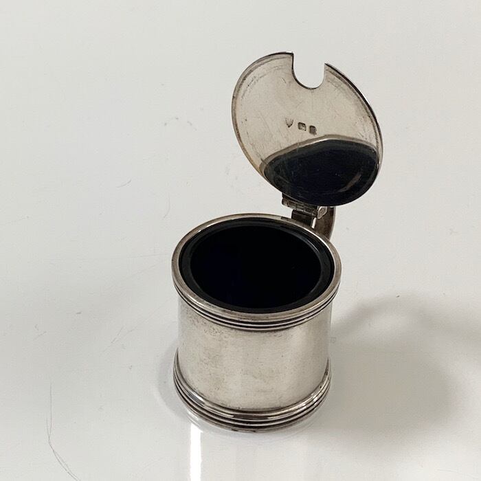 シルバーのフレームと濃いブルーのガラスの組み合わせによるマスタードポットです。シュガーポットとしても良いと思います。シルバーは、JB Chatterley & Sons Ltd, ロンドン1933年製です。H6cm W7cm D5cmほどの大きさです。