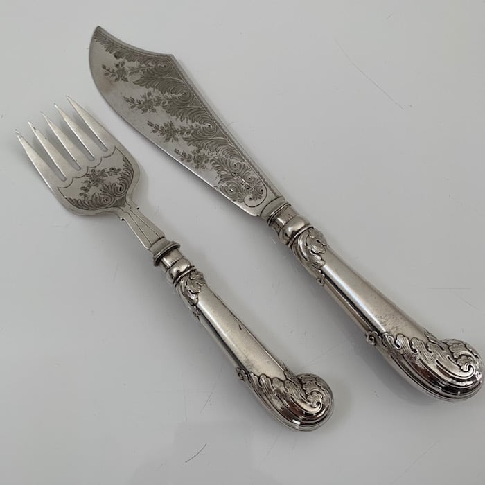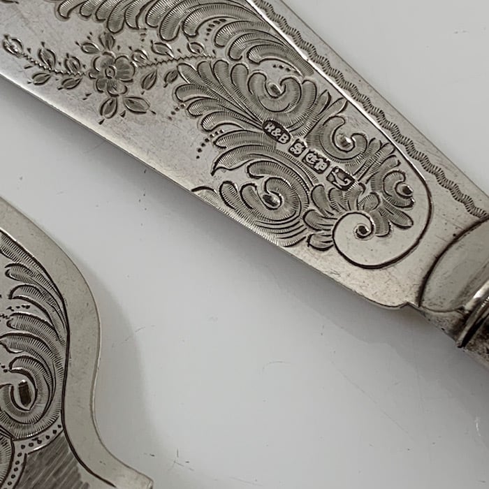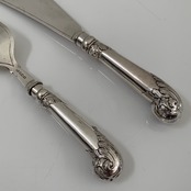 ロンドンにて購入のアンティークです。かなり大型ですがその割には軽いです。サーバーナイフは長さ31.5cm、幅約5cm、サーバーフォークは長さ約24cm、幅約5cmです。イギリス、シェフィールドのRoberts &Belk Ltd.製のシルバープレートです。