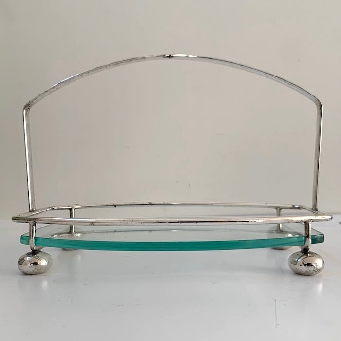 ロンドンにて購入のアンティークです。MADE IN ENGLAND E.P.N.Sの刻印が入ったシルバープレートのハンドル付き台座に厚手のガラスが載っています。シルバープレートには汚れが見られますがガラスは綺麗で透明感があります。